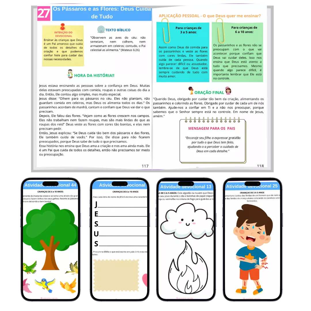 Atividades práticas e criativas: Após cada devocional, há 1 atividade para criança de 3 a 5 anos e outra para criança de 6 a 10 anos! Essas atividades incentivam as crianças a colocarem em prática o que aprenderam, tornando o aprendizado ainda mais significativo e divertido.